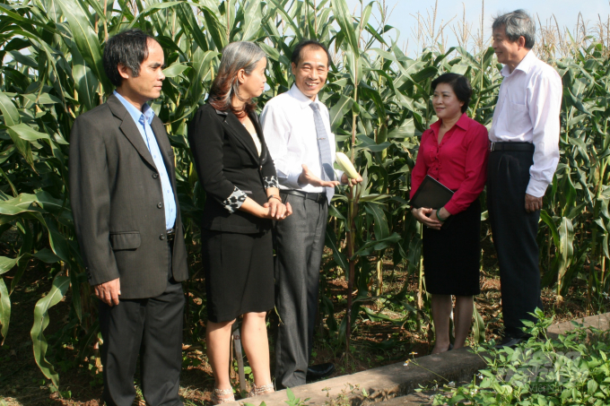 TS Phan Xuân Hào (đứng giữa) đang giới thiệu về giống ngô mới. Ảnh: Nhân vật cung cấp.
