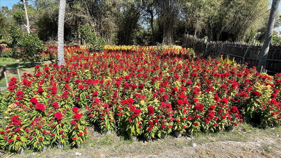 Những ngày này, dọc các con đường ở xã Tiến Lợi, TP.Phan Thiết, Bình Thuận, các vườn hoa Tết đang khoe sắc đỏ, vàng rực rỡ. Với hơn 20 năm kinh nghiệm trồng hoa Tết, ông Phạm Tấn Hưng đã chia vườn nhà thành nhiều khu trồng các loại hoa như mồng gà, long phụng, vạn thọ, hướng dương.